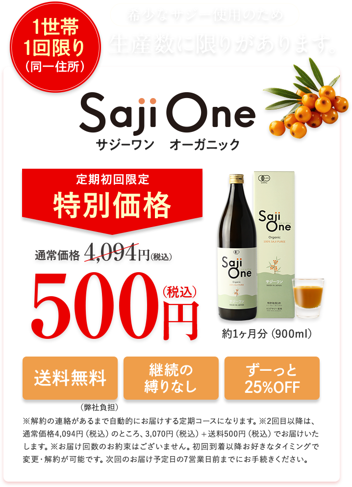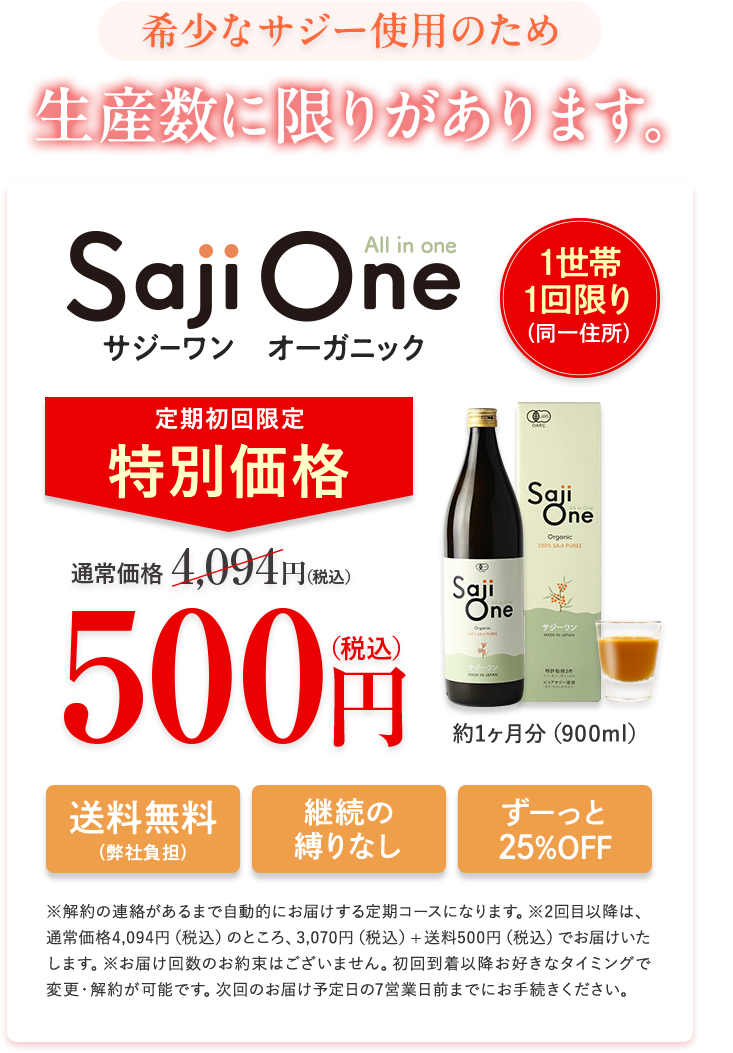 ・この商品はドリンクタイプの健康食品です。1日あたり30ml~60mlを目安として、お好みに合わせて適宜お召し上がりください。 ・サジー果実の成分が沈殿・分離・浮遊している場合がございますが、品質にはまったく問題ございません。フタをしっかり閉め、よく振ってからお召し上がりください。 |
